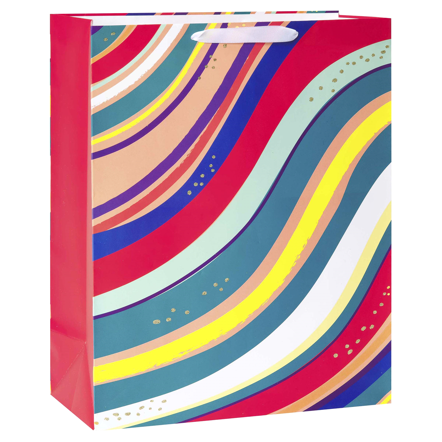 Add a little extra flair to any occasion with this bright gift bag. The extra large bag features whimsical waves of various colors, including red, blue, yellow and white, while also including gold gli…