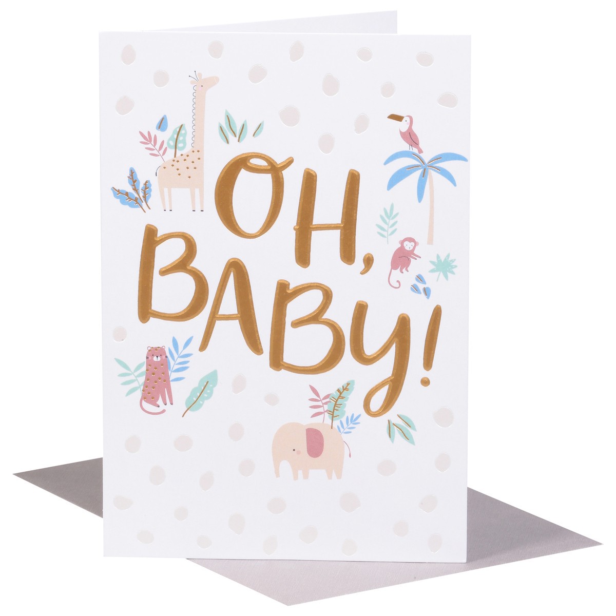 Cute overload! This Baby Congrats card is too precious for words! The design features a collection of sweet baby animals in a whimsical jungle scene, illustrated in a clean, simple style, with soft, m…
