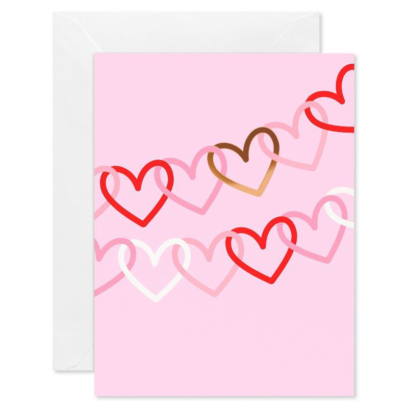 - DESIGN & FINISHINGS: These elegantly designed note cards feature a chain of hearts in shades of red and gold on a soft pink background