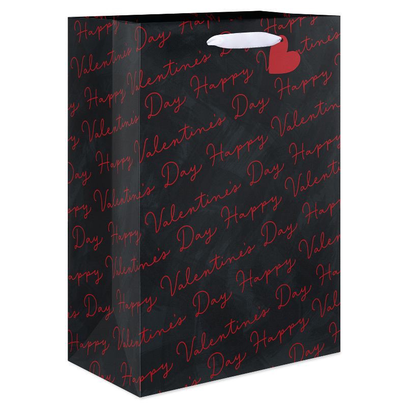 - DESIGN & FINISHINGS: This medium Valentine's Day gift bag features 'Happy Valentine's Day' repeated in elegant red script on a chic black background.
