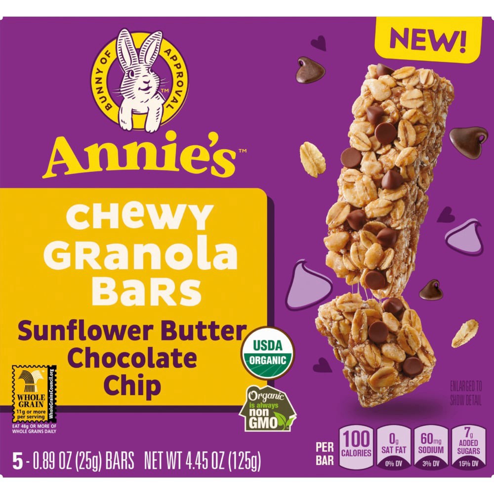 Meet your go-to chewy granola bar! Annie's Sunflower Butter Chocolate Chip Chewy Granola Bars pack an undeniably delicious chocolaty taste and chewy texture. Each snack bar is made with whole-grain oa…