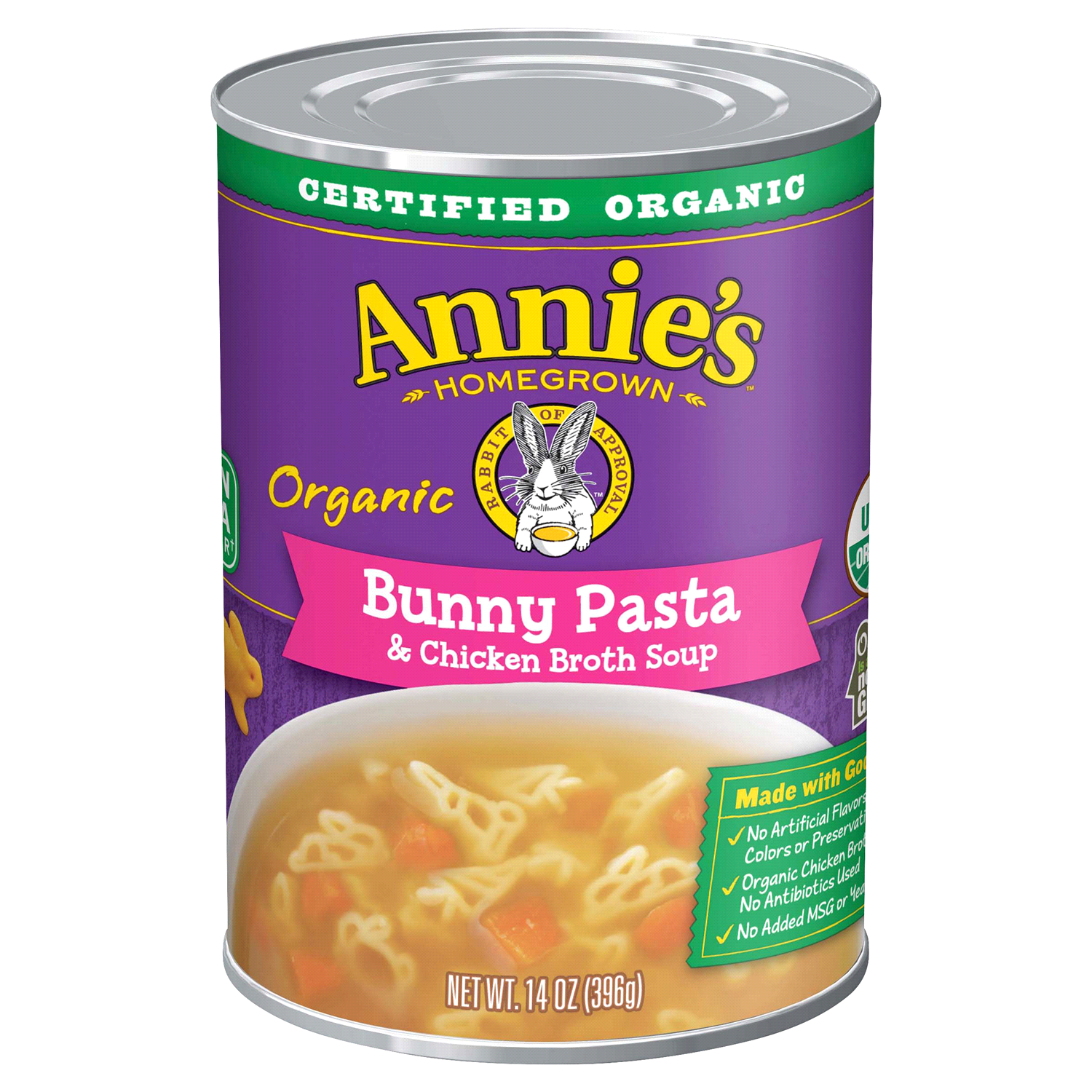 Annie's Organic Bunny Pasta and Chicken Broth Soup is canned food you can feel good about. Made with organic chicken broth, this ready to eat soup features bite-size carrot pieces and bunny-shaped pas…