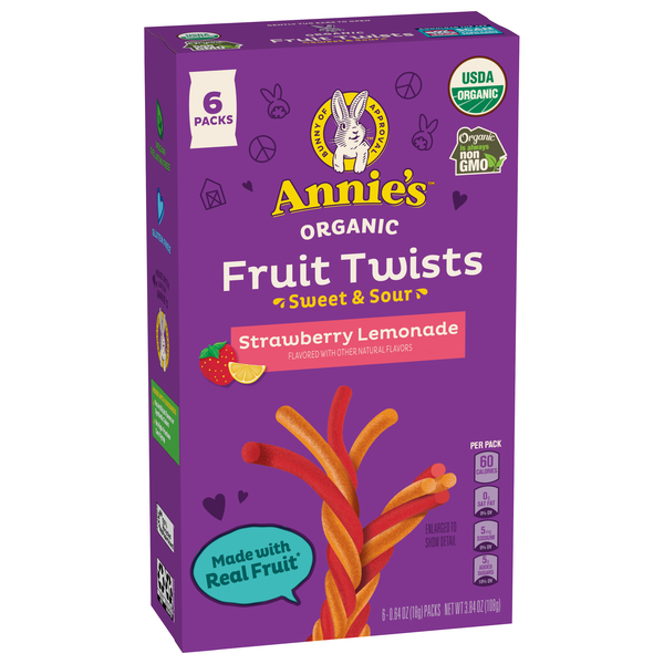 Put a sweet and sour twist on snack time! This pack of Annie's Organic Sweet and Sour Fruit Twists features the irresistible Strawberry Lemonade fruit flavored snacks everybunny loves. They're made wi…