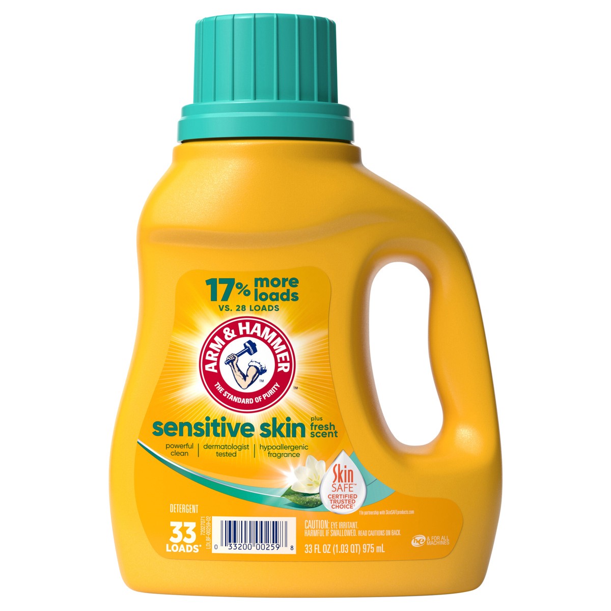 ARM & HAMMER Sensitive Skin Liquid Laundry Detergent is gentle on skin, but powerful on dirt. This HE laundry detergent liquid is concentrated with 2X powerful stain fighters in every load vs the lead…