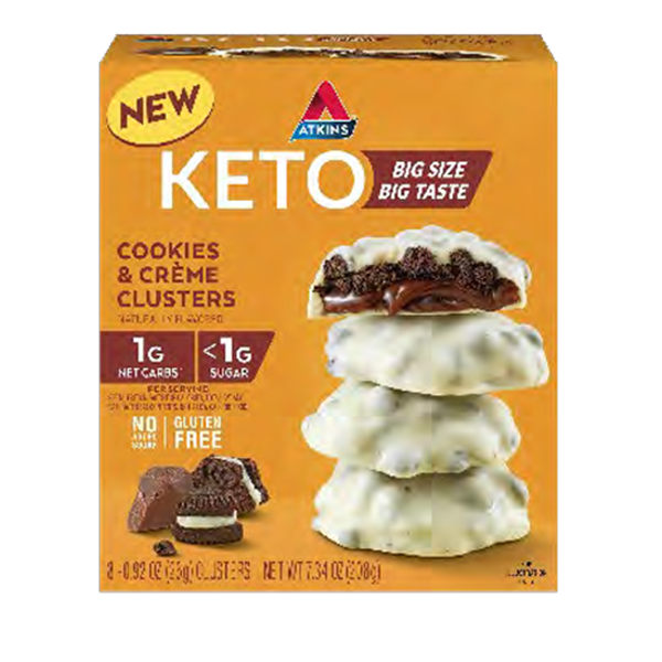 Atkins™ Keto Cookies & Crème Clusters bring a keto friendly* twist to the classic taste of cookies and cream. Enjoy the satisfying crunch of cookie pieces and a creamy, chocolatey center - all wrapped…