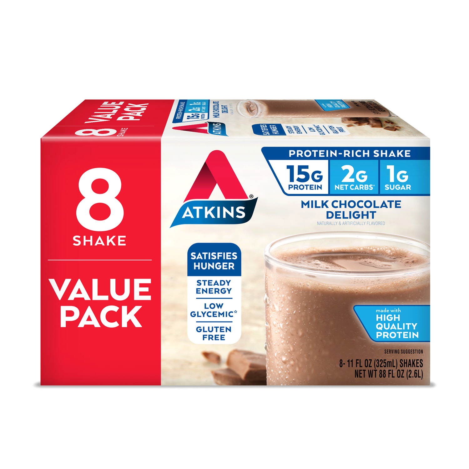 Enjoy Atkins™ Milk Chocolate Delight Protein Shakes. Each delicious gluten free and low glycemic milk chocolate flavored shake delivers 15g of protein to satisfy your hunger and keep you moving. These…