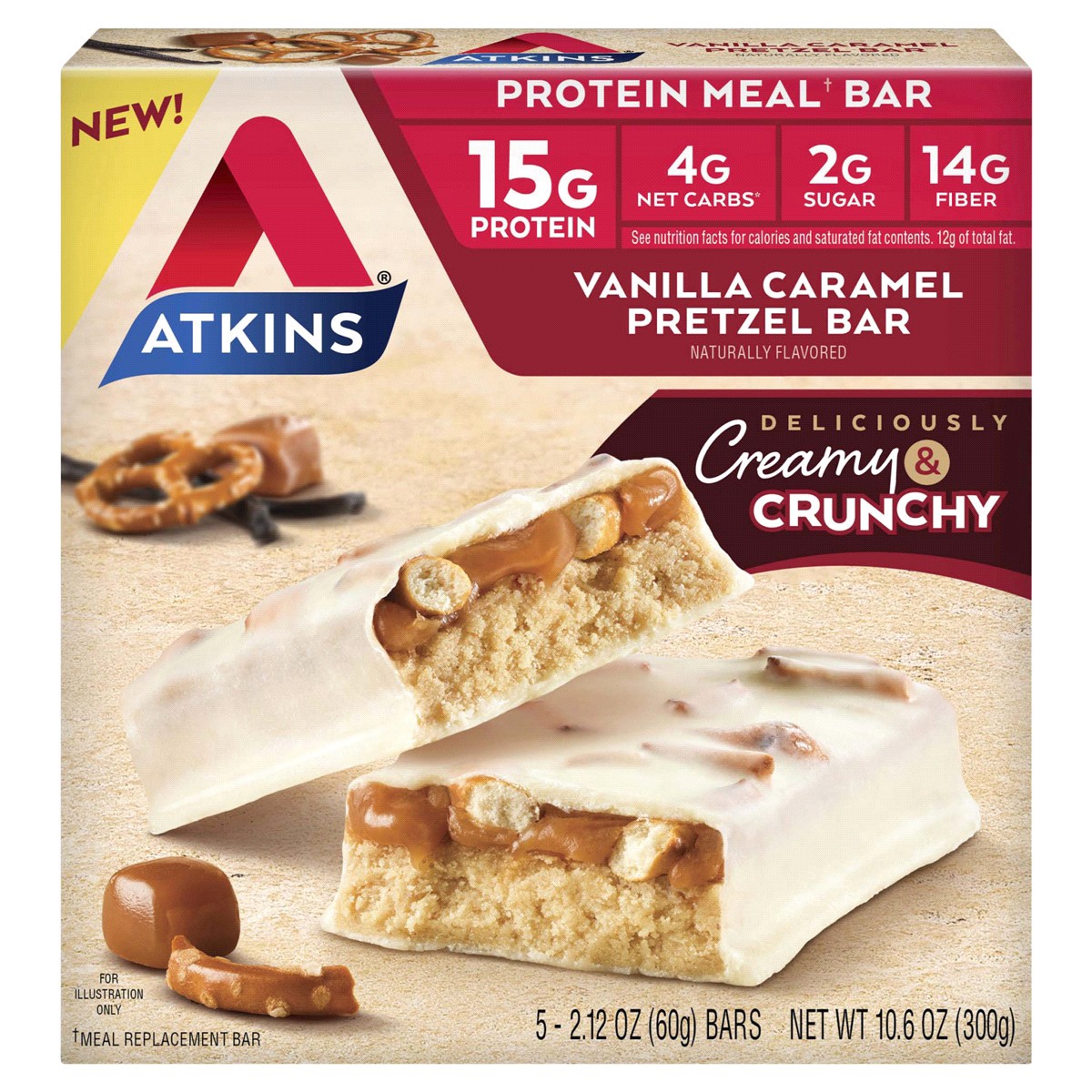 Atkins™ Vanilla Caramel flavored Pretzel Meal Bars are where sweet and salty flavors come together in a crunchy, creamy bar. This low sugar* keto friendly* protein bar is the perfect choice for when y…