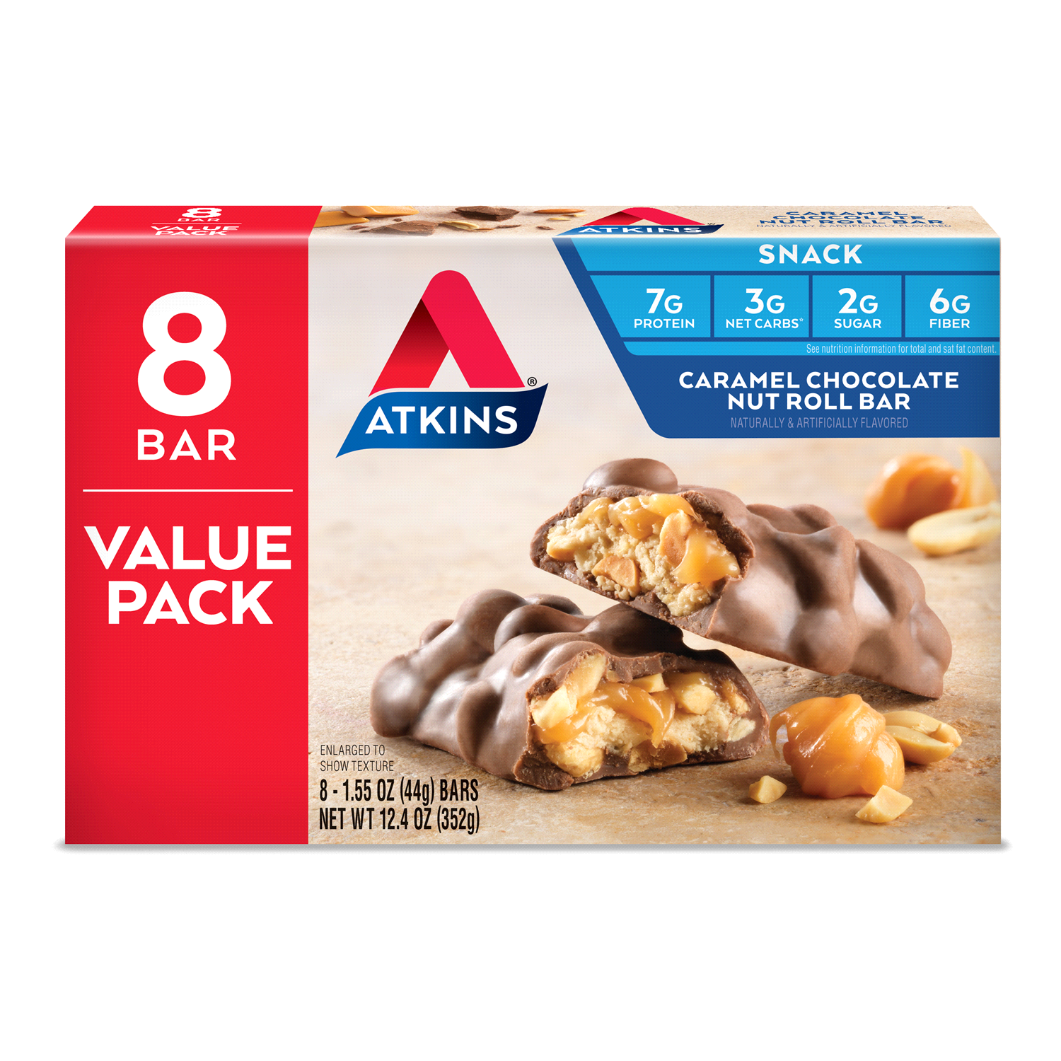 Atkins™ Caramel Chocolate Nut Roll Snack Bars bring together the mouth-watering flavors of caramel and chocolate and the satisfying crunch of peanuts. This low sugar* snack bar is rich in fiber* and t…