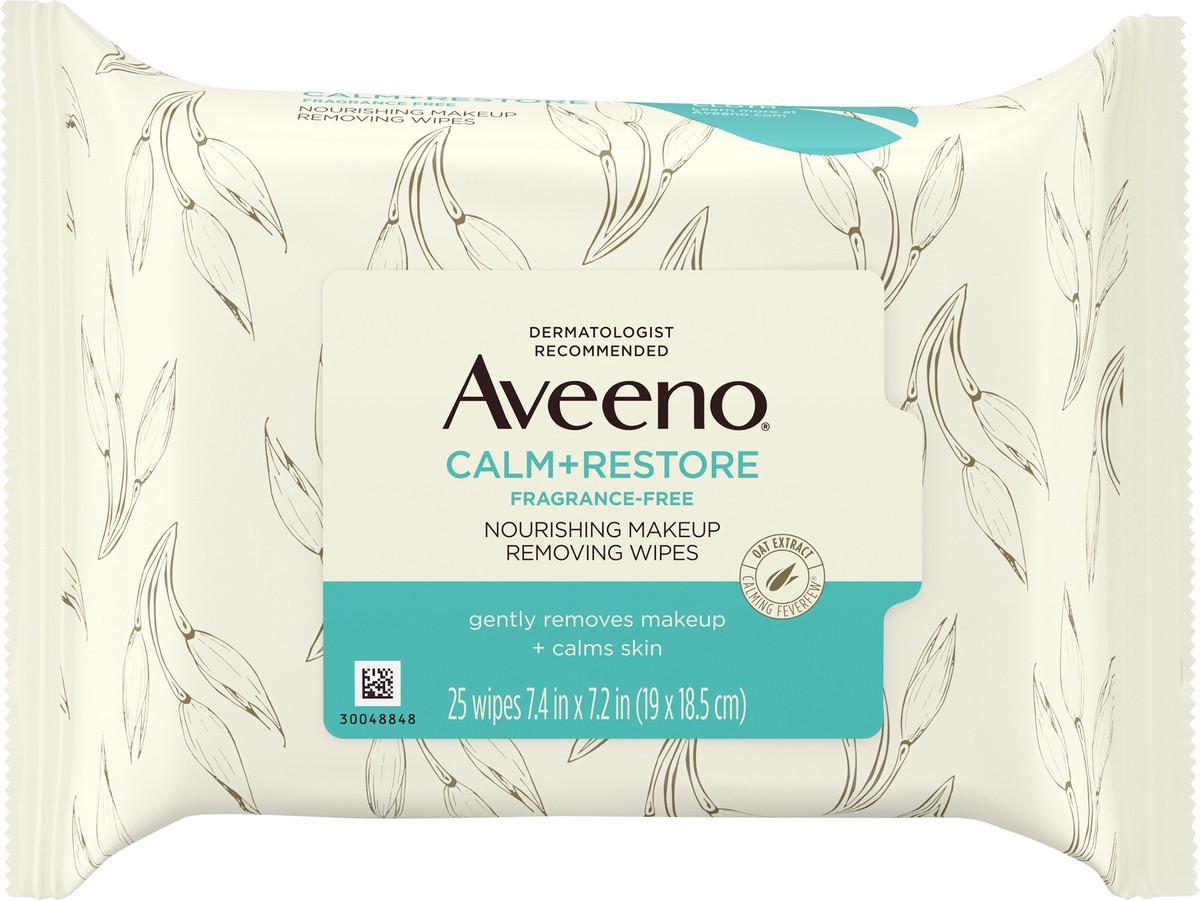 Remove makeup and nourish skin in one step with Aveeno Calm + Restore Nourishing Makeup Removing Wipes. Designed with the earth in mind, these 100% plant-based fragrance-free facial cloths from a derm…