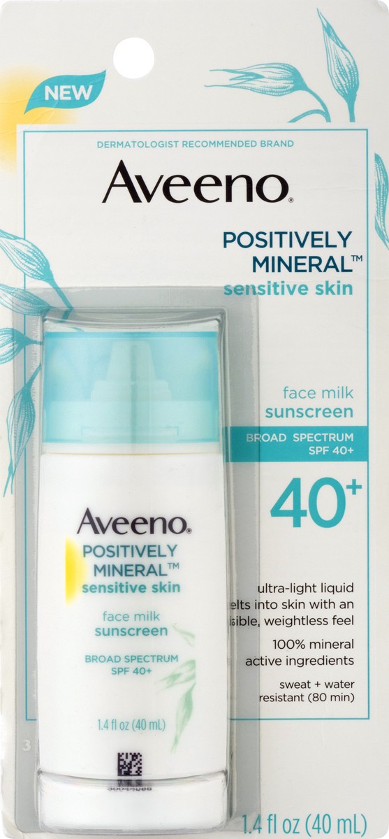 Enjoy superior facial sun protection with Aveeno Positively Mineral Sensitive Skin SPF 40+ Sunscreen Face Milk. Designed for sensitive skin, this lightweight mineral liquid sunscreen contains naturall…
