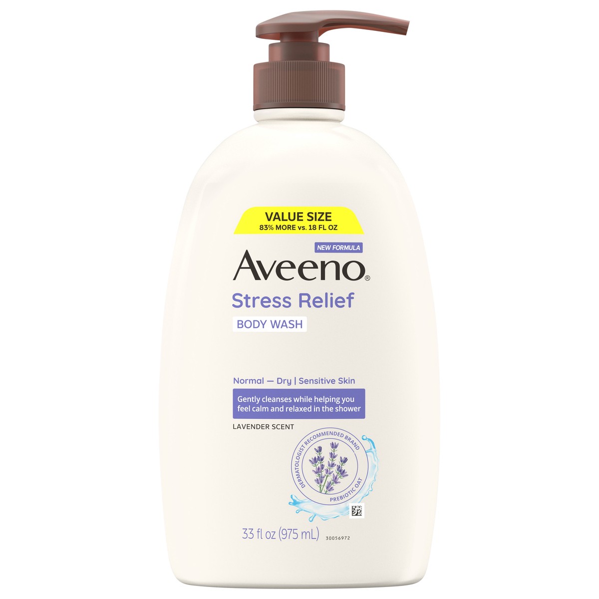 Relax while you cleanse in the shower with Aveeno Stress Relief Body Wash for women & men, infused with nourishing prebiotic oat & a calming lavender scent. This soothing shower gel is ideal for norma…