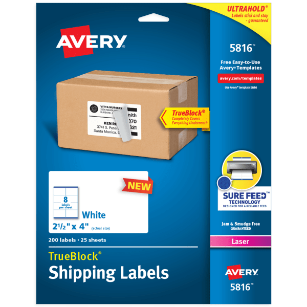 Avery Shipping Labels With Trueblock Technology, 5816, 4"W X 2-1/2"D, White, Pack Of 200 Labels