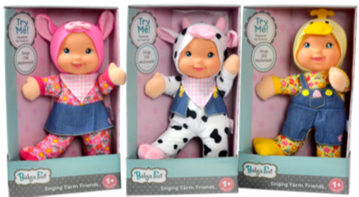 Baby's FirstSinging Farm Friends sing Old McDonald Had a Farm when you squeeze their tummy! Comes in 3 fun styles - Pig, Cow & Duck. Machine washable. Lifetime Guarantee. Safe for Children ages 1 year…
