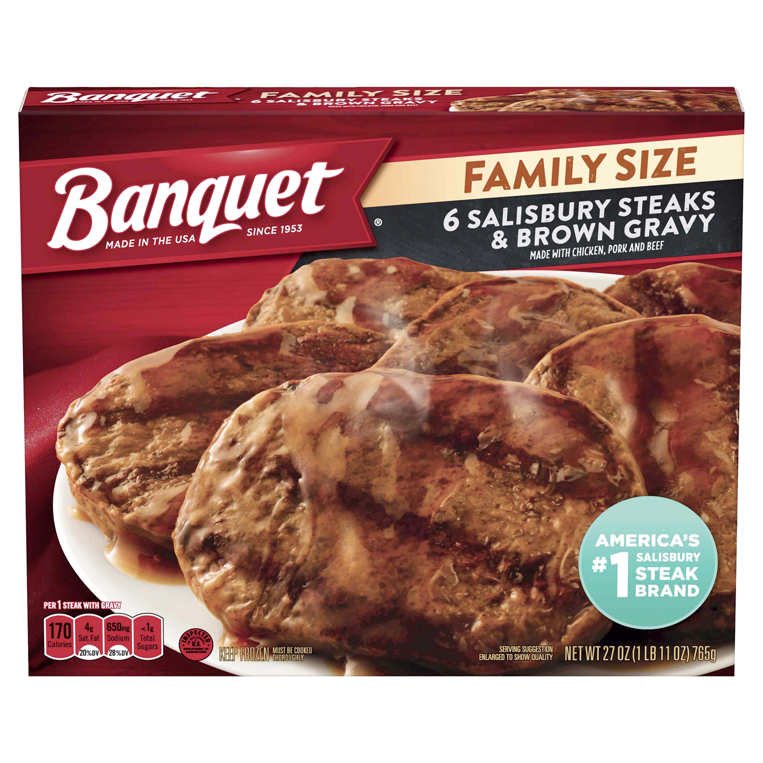 With quality, mouthwatering ingredients, a great frozen meal option is just minutes away with Banquet Family Size Salisbury Steaks and Brown Gravy. Satisfy your family's savory cravings with this fami…