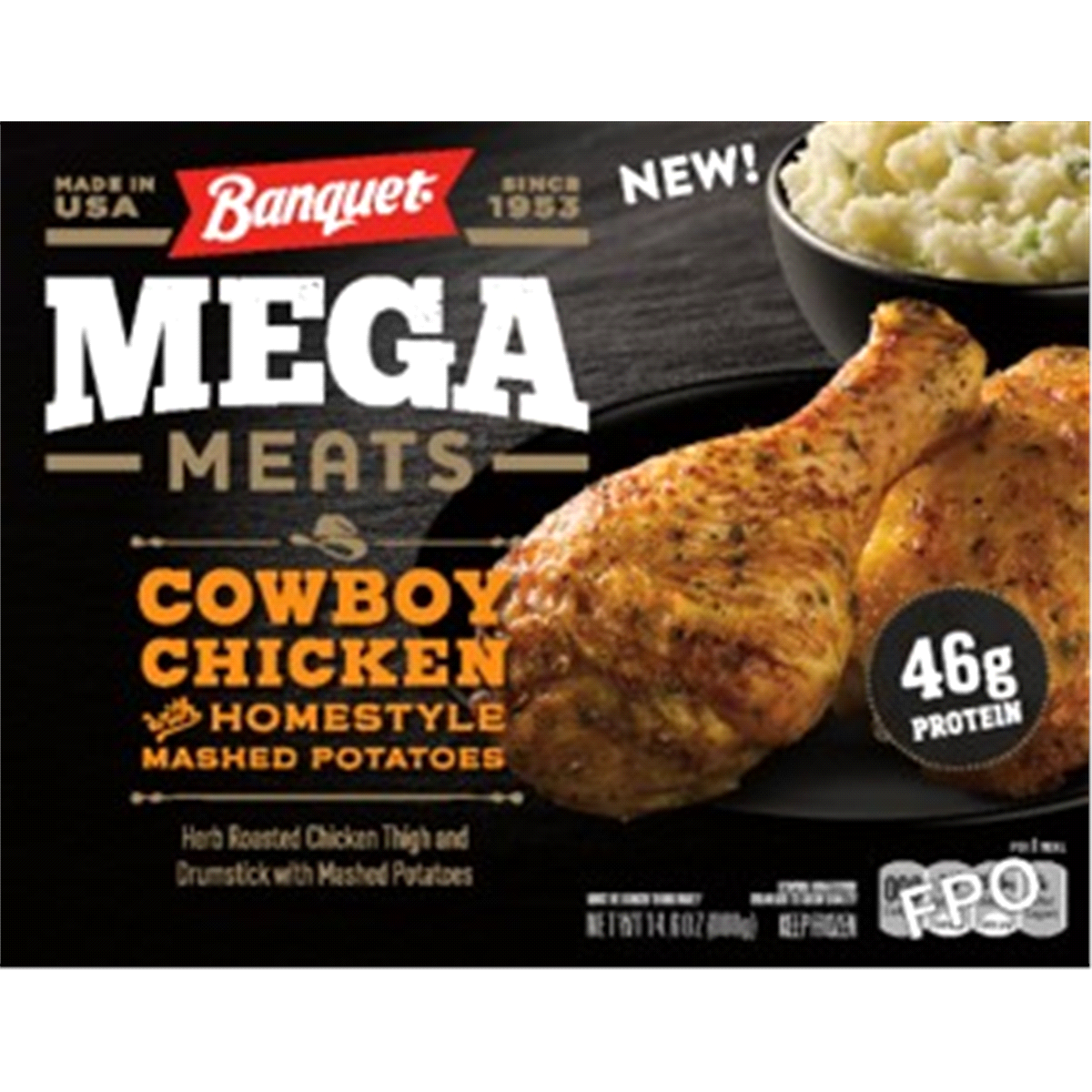 Cowboy chicken with homestyle mashed potatoes. Herb roasted chicken thigh and drumstick with mashed potatoes. Per 1 Meal: 450 calories; 6 g sat fat (30% DV); 1300 mg sodium (57% DV): 2 g total sugars.…