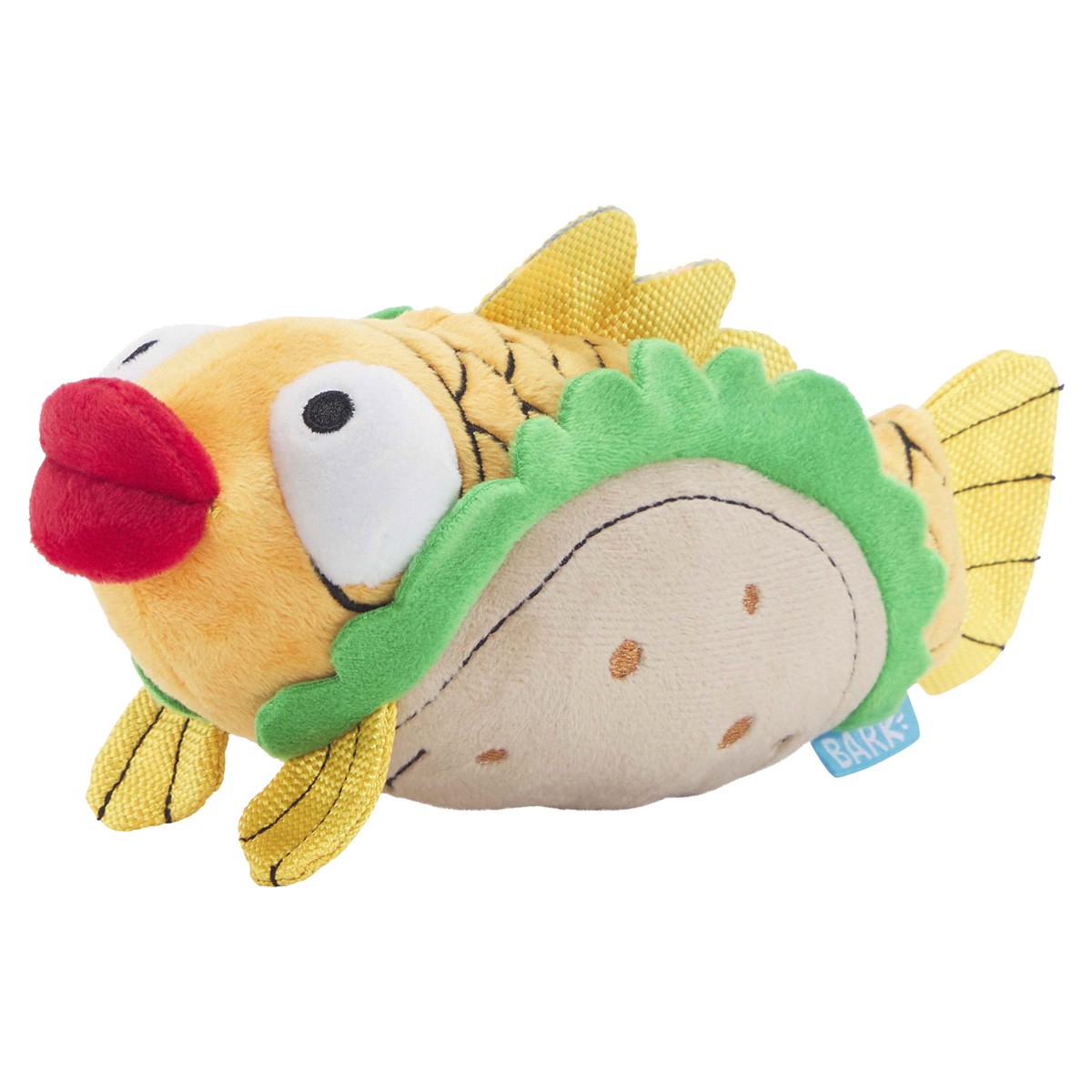 Your 4legged friend will love playing with this BARK Ernesto the Fish Taco Plush Squeaker Dog Toy. Plush toy with durable nylon fins looks like a fish in a yummy taco and has a large squeaker inside f…