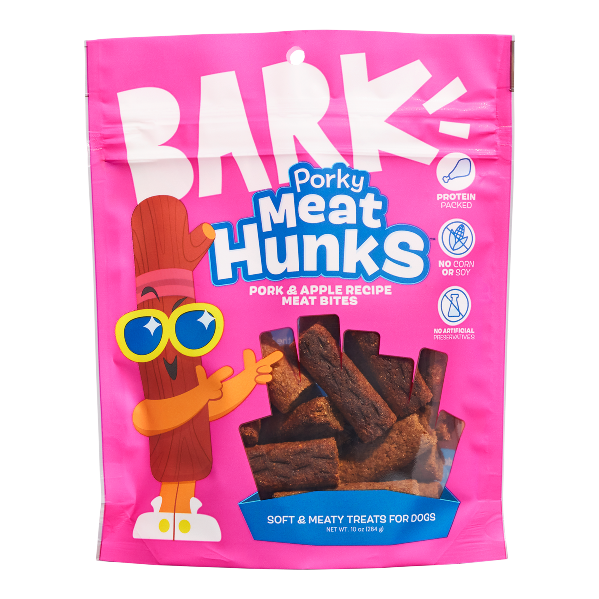 Remember all the fun snack mascots you grew up with? Well, your dog doesn't! BARK is here to fix that! Porky Meat Hunks™pack soft & meaty, pork recipe dog treats into a pouch straight out of your chil…