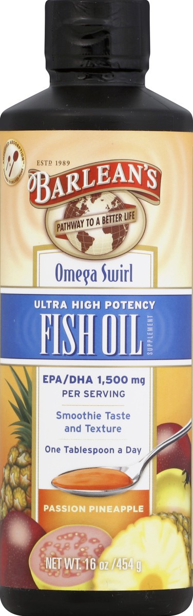 Supplement. EPA/DHA 1,500 mg per serving. Smoothie taste and texture. One tablespoon a day. Estd. 1989. Pathway to a better life. Amplified Absorption: Designed to deliver more. Barlean's High Potency…