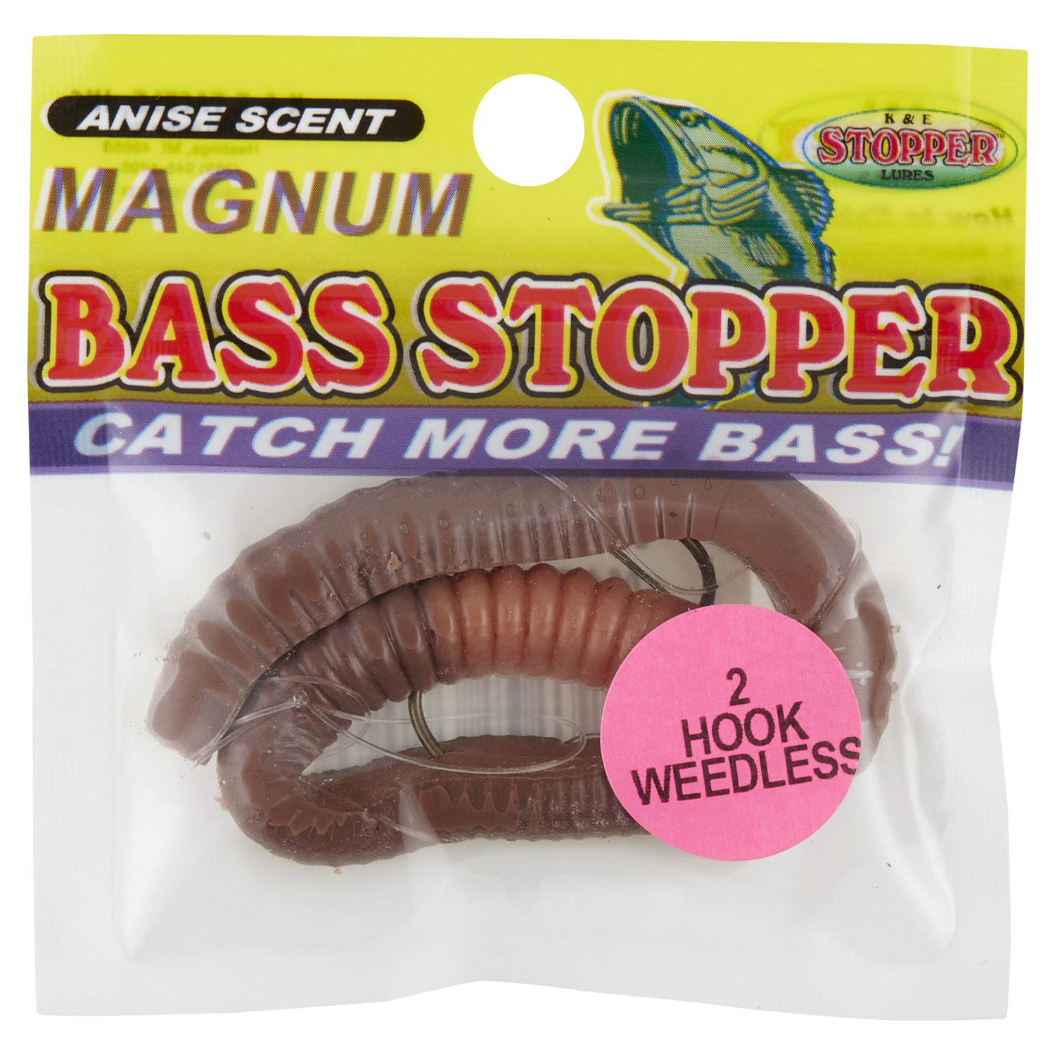 A hand tied rig on 14lb test line ensures the largest fish will be tamed. The Bass Stopper Magnum provides a larger profile. 2 weedless hooks allow the ability to effectively fish cover. The natural m…