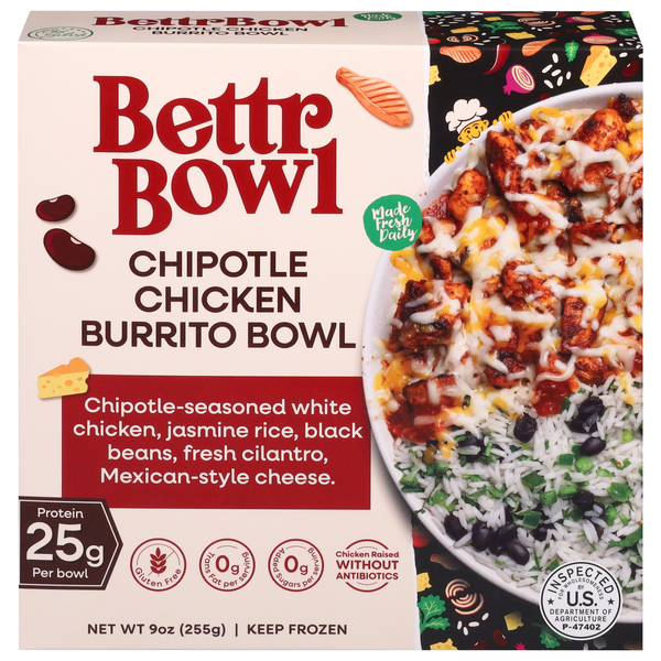 Our 24-hour marinated, antibiotic-free chicken is seasoned with a smoky chipotle blend and served with Mexican-style cheese, black beans, and fresh cilantro over jasmine rice. This high-protein, delic…