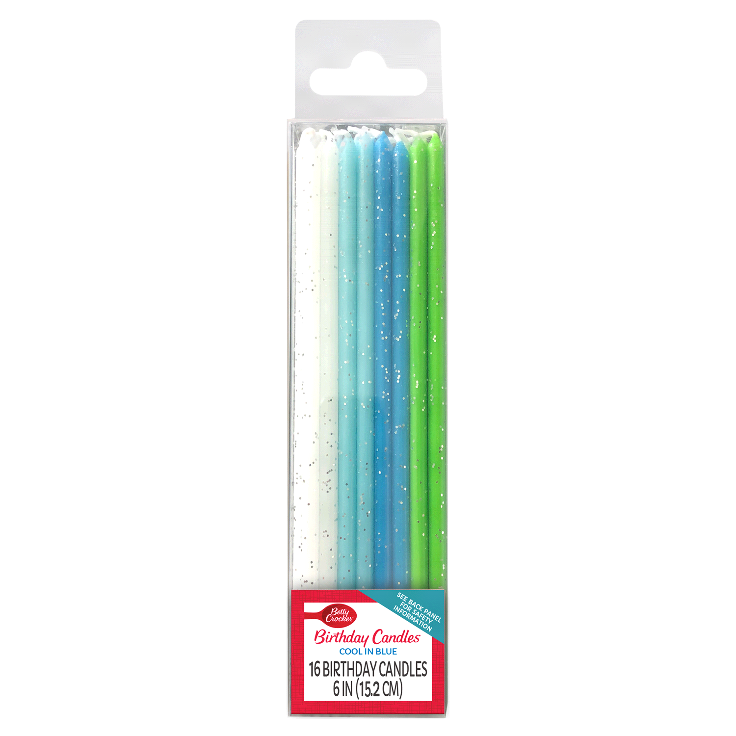 Betty Crocker Cool in Blue pillar candles celebrate all occasions. These tall candles will be the life of the party at your next celebration. Pack contains 16 candles, 6 tall