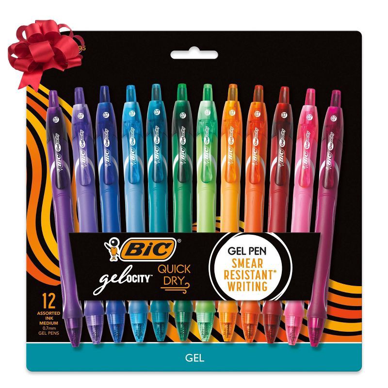 - Pack of twelve (12) BIC Gelocity Quick Dry Gel Pens in assorted colors included
