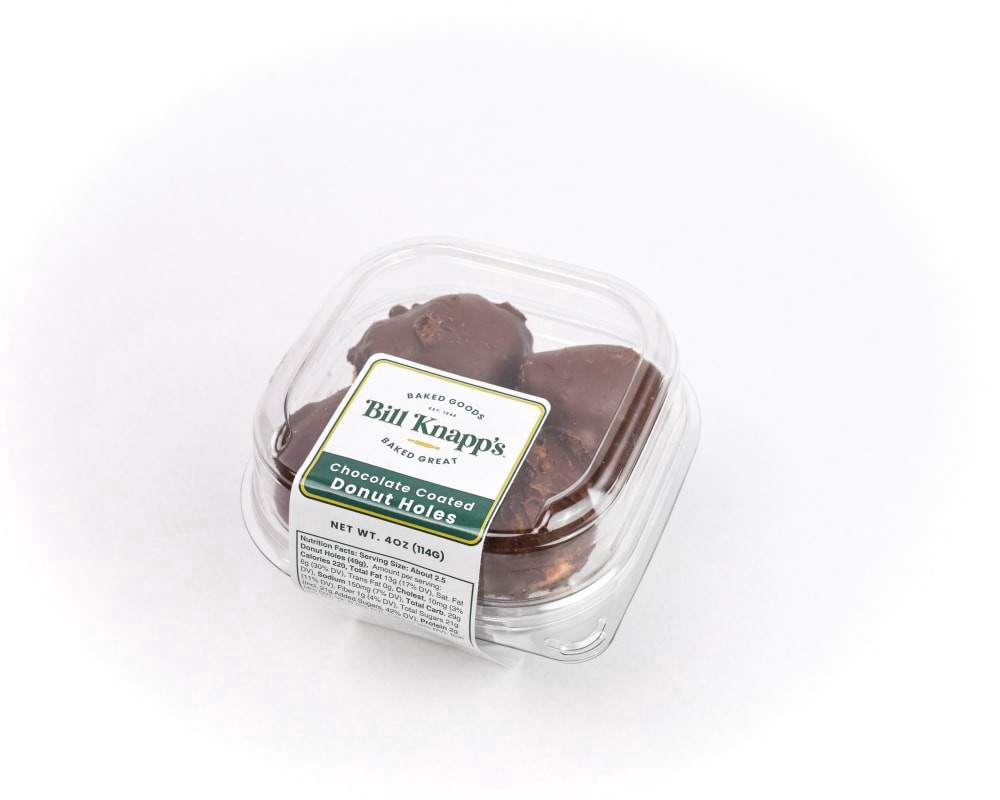Bill Knapp's® Chocolate Coated Donut Hole Cups. Oversized, spiced cake donut hole, enrobed in chocolate.