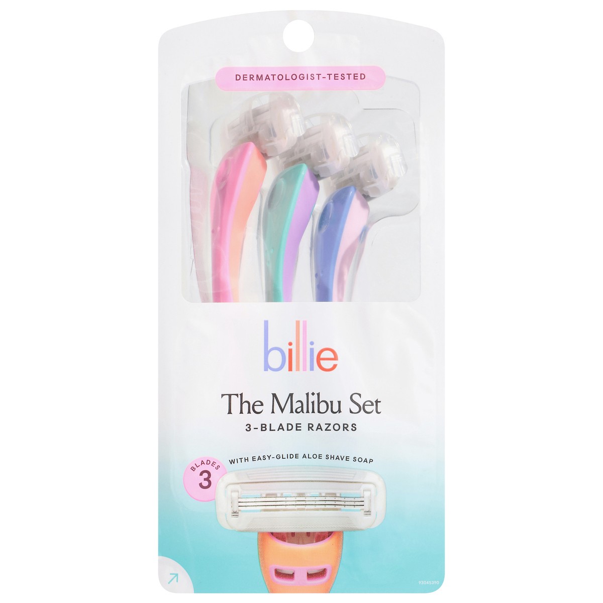 Meet the Malibu Set, a trio of 3-blade razors from Billie lovingly designed to deliver a great shave with minimal irritation. Tested by dermatologists, they''re gentle on skin and cushioned in aloe sh…