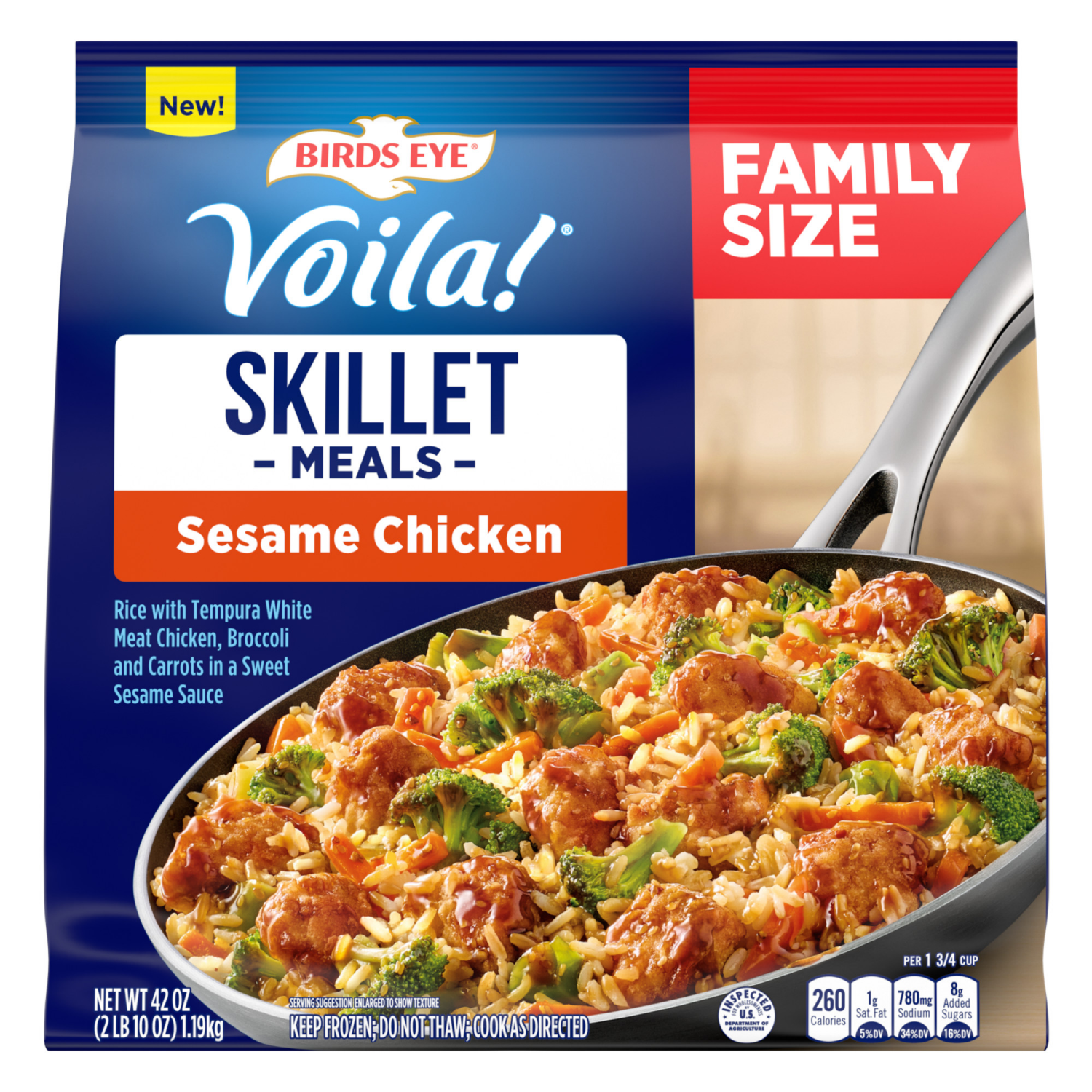Serve up a delicious meal in minutes with Birds Eye Voila! Sesame Chicken Family Size Skillet Meal. With premium Birds Eye vegetables, quality meat and chef-inspired sauces in every bag, Birds Eye Voi…