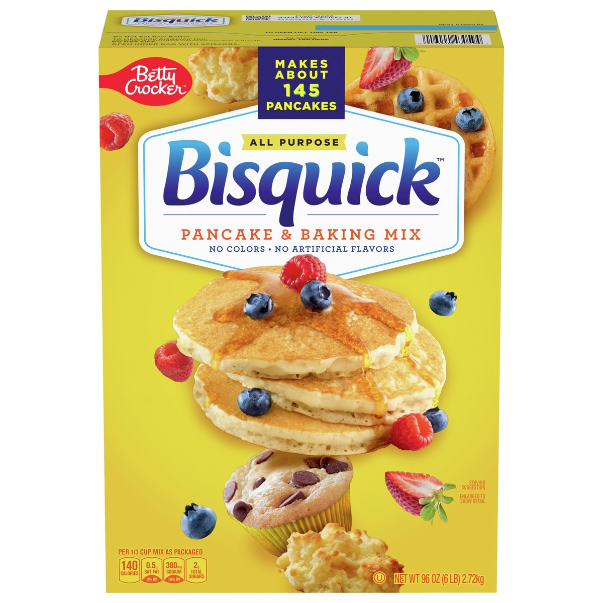 Make quick and easy family breakfast favorites with Betty Crocker Bisquick All Purpose Pancake & Baking Mix. This versatile pancake mix can be used for biscuits, muffins, pancakes, waffles and even pi…