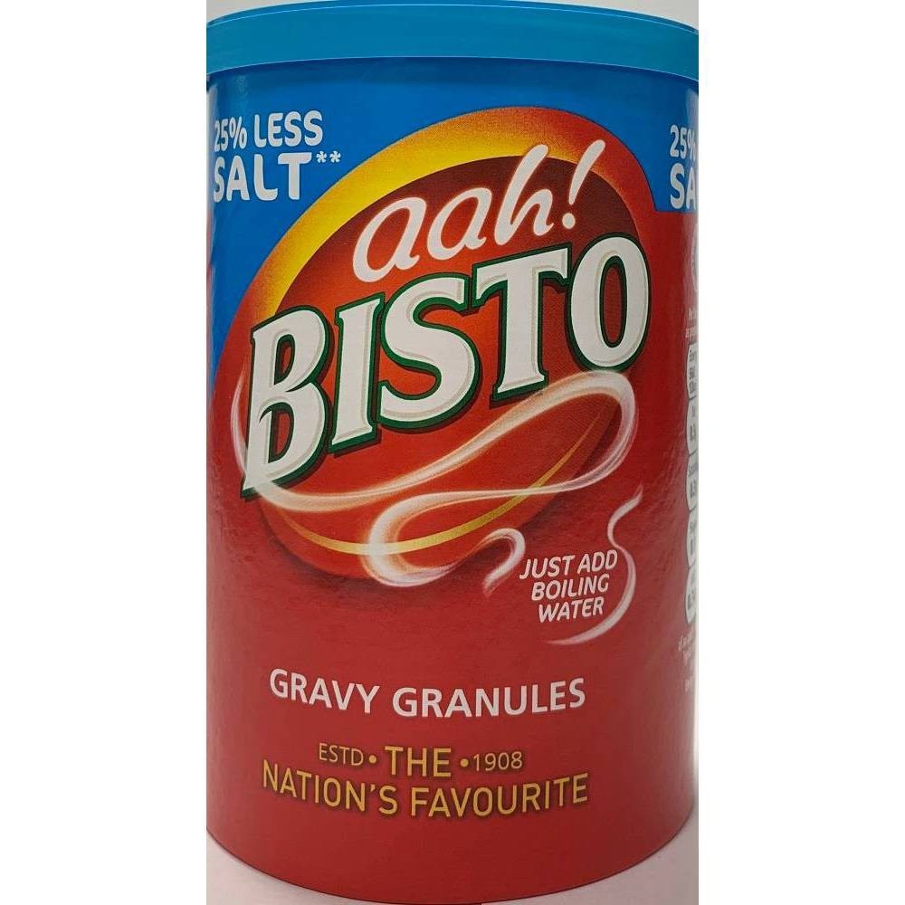 25% less salt (Contains 25% less salt than Standard Bisto Favourite Gravy Granules). Just add boiling water. Estd the 1908. Nation's favourite. Bisto reduced salt (Contains 25% less salt than Standard…