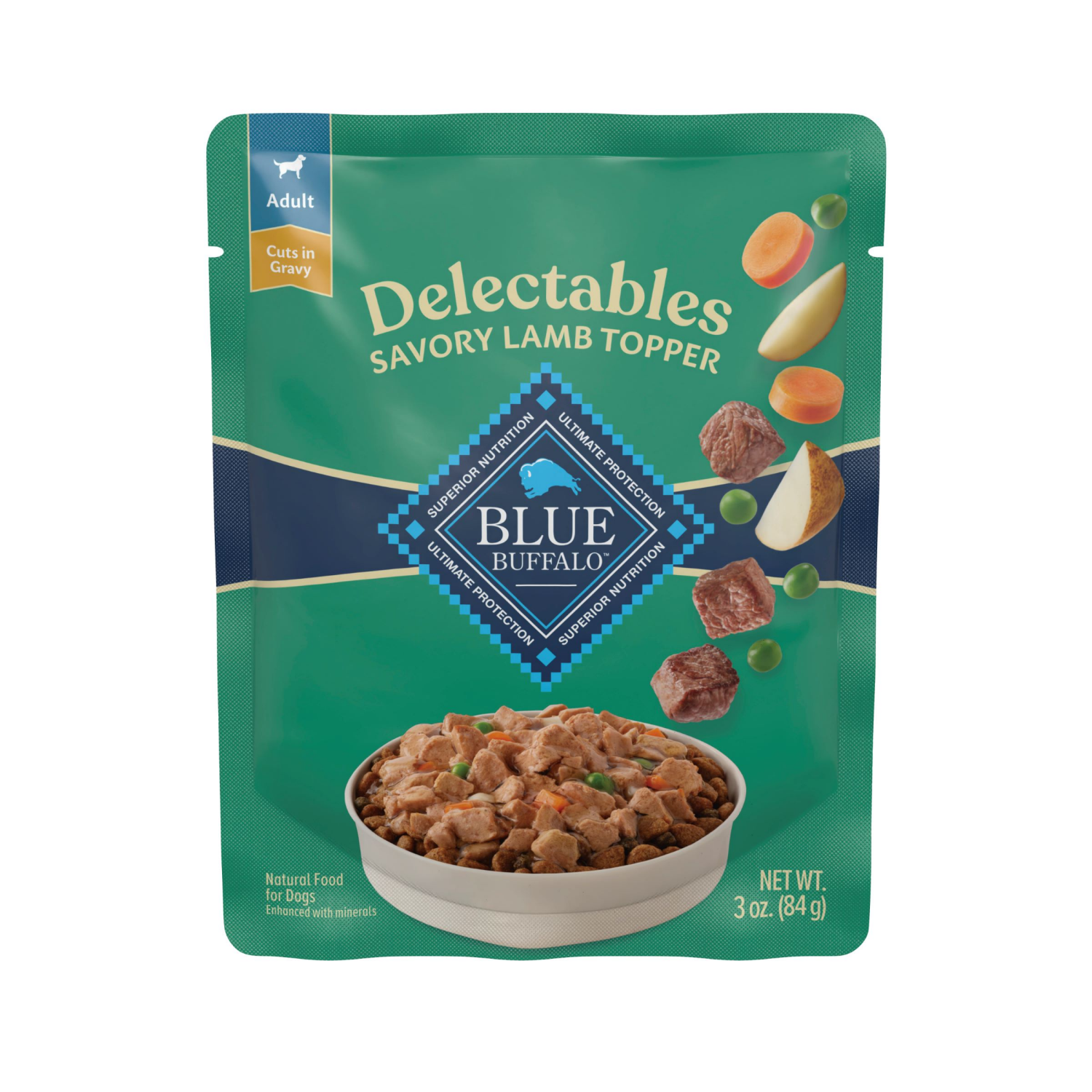 For the dog that deserves the very best, theres BLUE Delectables Savory Lamb Topper. This deliciously natural recipe is made with tender bits of real lamb mixed with garden vegetables in a savory grav…