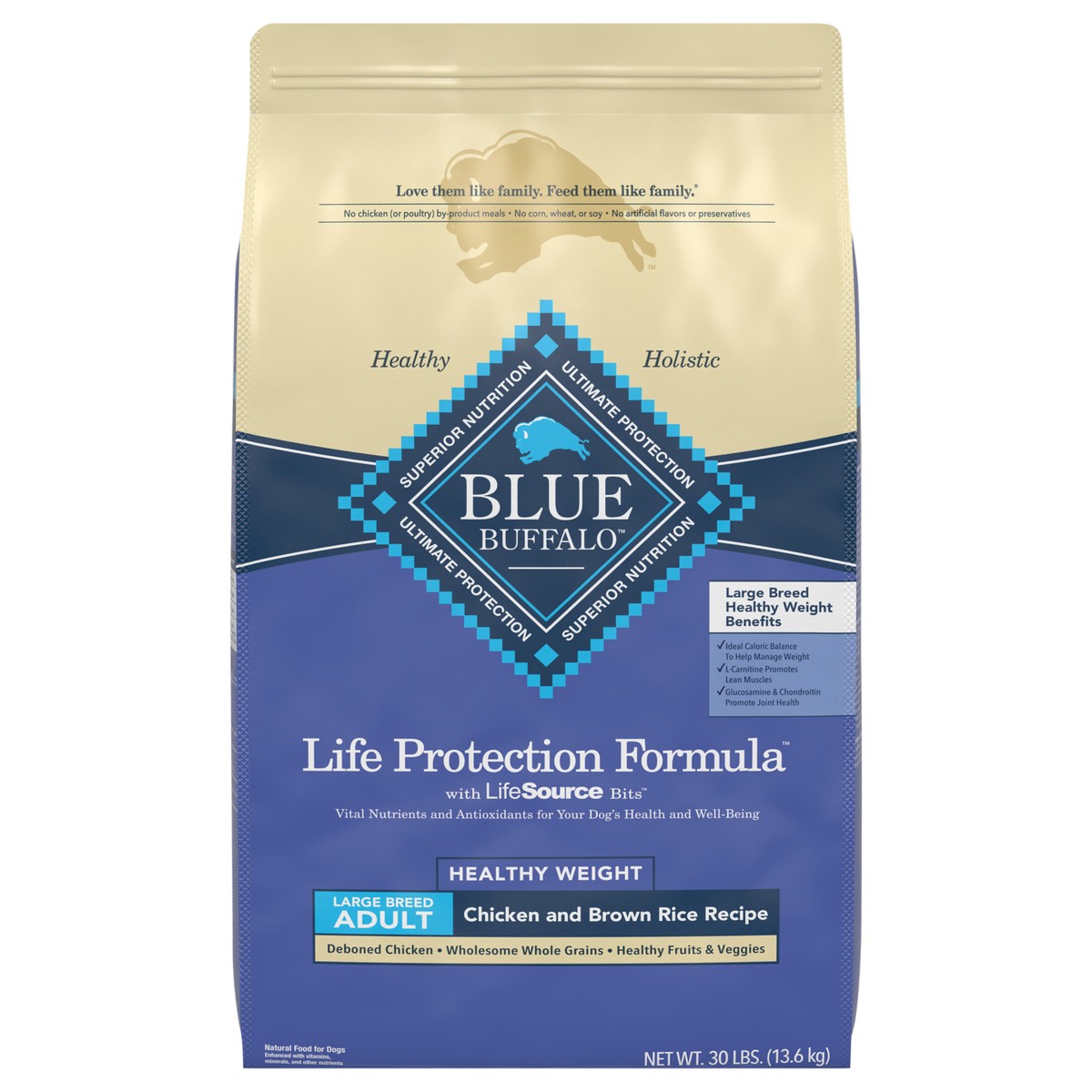 BLUE Life Protection Formula Large Breed Healthy Weight Dry Dog Food is formulated with glucosamine and chondroitin to help support joint health and is made without the extra calories to help dogs ach…