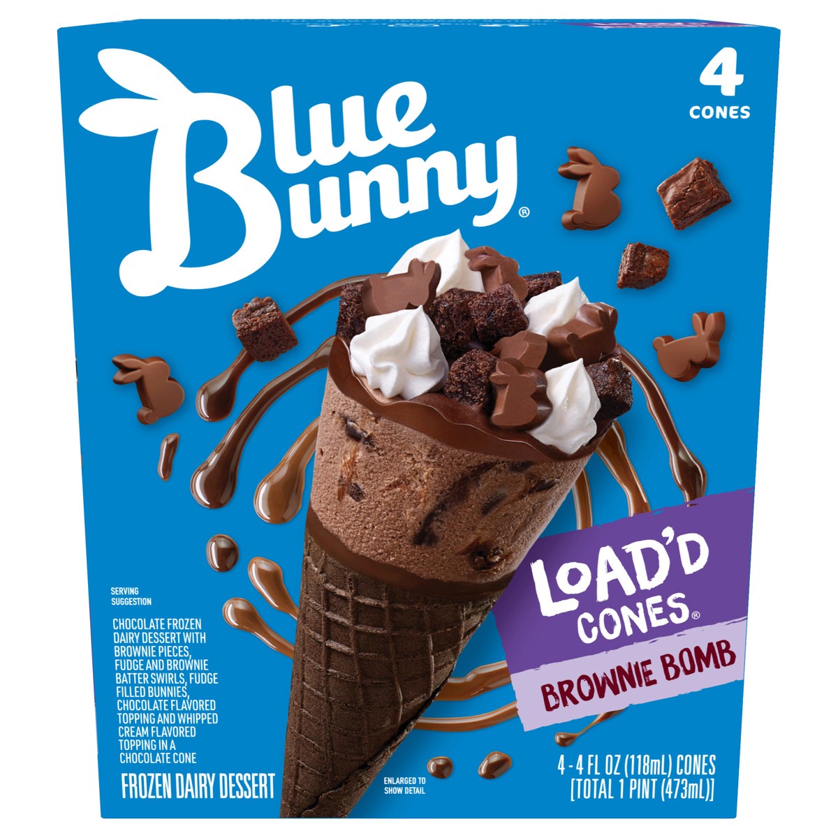 Share the ice cream parlor experience from your freezer with Blue Bunny Load'd Cones Brownie Bomb. Every creamy cone is loaded with mix-ins for a brownie bomb you won't forget. Chocolate frozen dairy …
