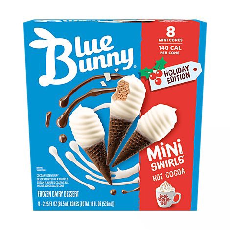 Celebrate the holiday season with limited edition Blue Bunny Hot Cocoa Mini Swirls - mini in size, mighty in swirl! Chocolate frozen dairy dessert dipped in a whipped cream flavored coating all inside…