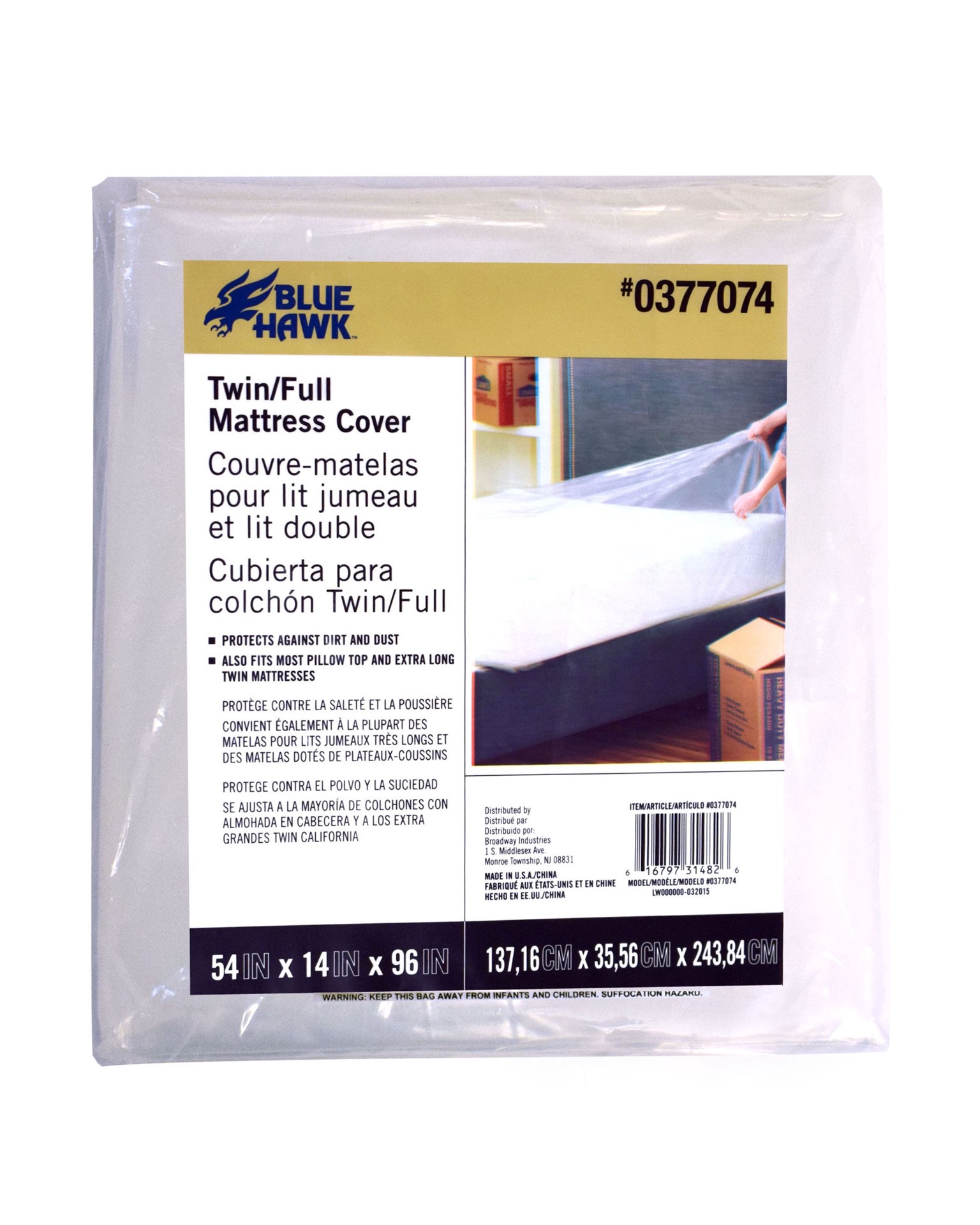 Tough material protects against dirt and dust. Fits most extra long full twin pillow top mattresses. Twin/Full bed mattress bag. Bag size 54 in x 14 in x 96 in.