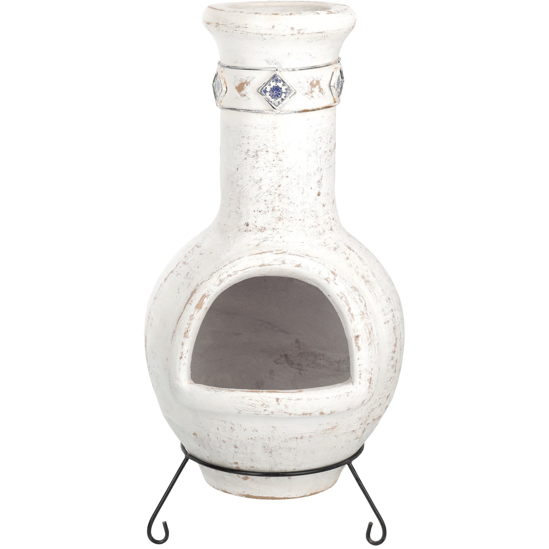Enjoy the warmth of a cozy fire during the cooler autumn months with this bulb shape clay chiminea in white wash from Blue Orange Pottery. Decorative clay tile pieces are included atop this chiminea a…
