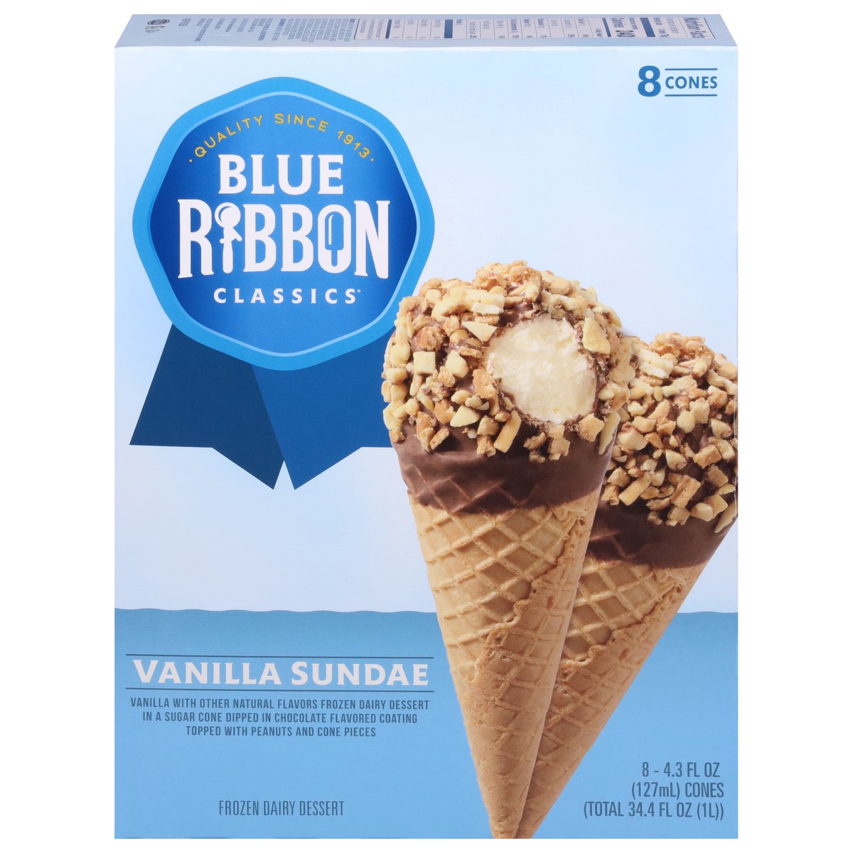 Creamy vanilla flavored frozen dairy dessert dipped in chocolate flavored coating, topped with peanuts and cone pieces, all inside a crunchy sugar cone. One for everyone! At Blue Ribbon Classics, we d…