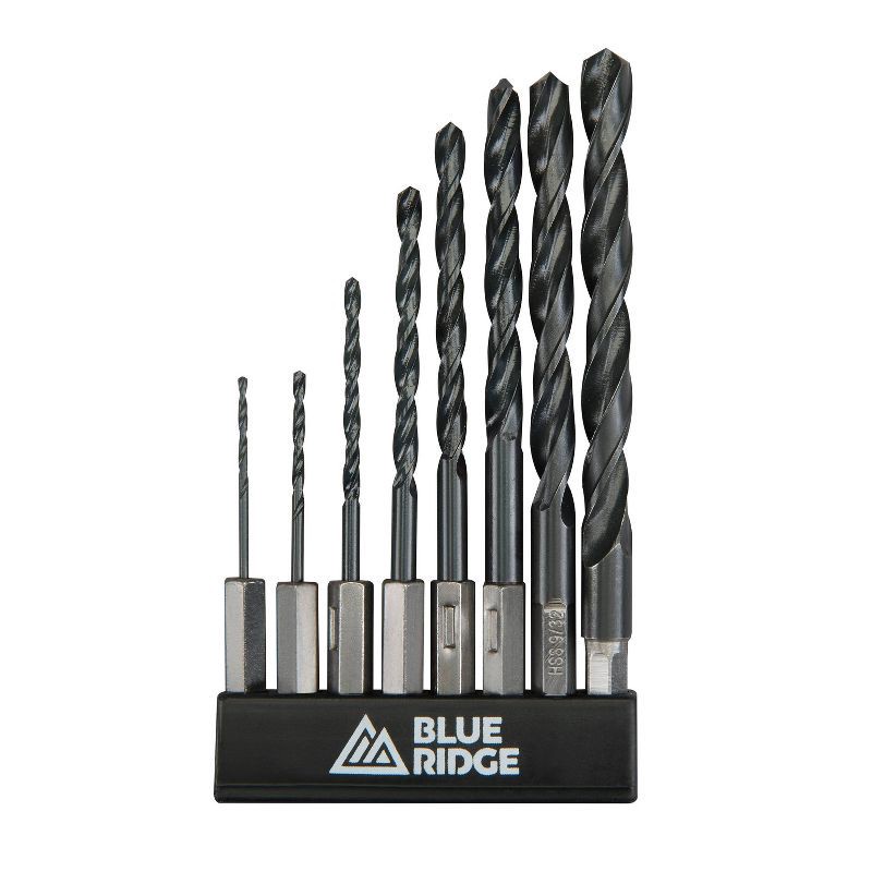 This BLUE RIDGE 8-piece Hex Shank Drill Bit Set is designed for a more secure fit than other round shank sets. These 8 quick connecting bits are the most common, useful sizes and are made of high-speeā¦