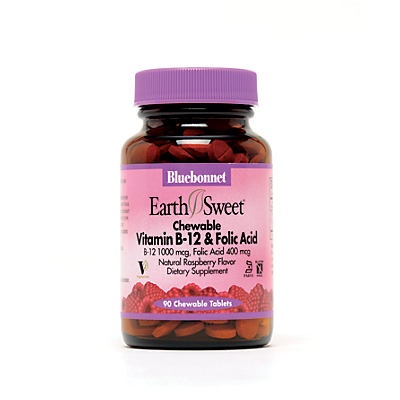 Bluebonnets EarthSweet Chewables Vitamin B12 & Folic Acid Tablets contain 1000 mcg of pure crystalline vitamin B12 and 400 mcg of folic acid in a natural raspberry flavor. Sweetened with EarthSweet, t…