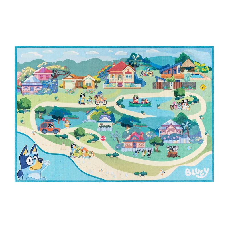 Bring the playful world of Bluey to life in your child's room with this vibrant and cozy area rug. Featuring digitally printed Bluey-themed designs depicting Bluey's home town of Brisbane, Australia, …