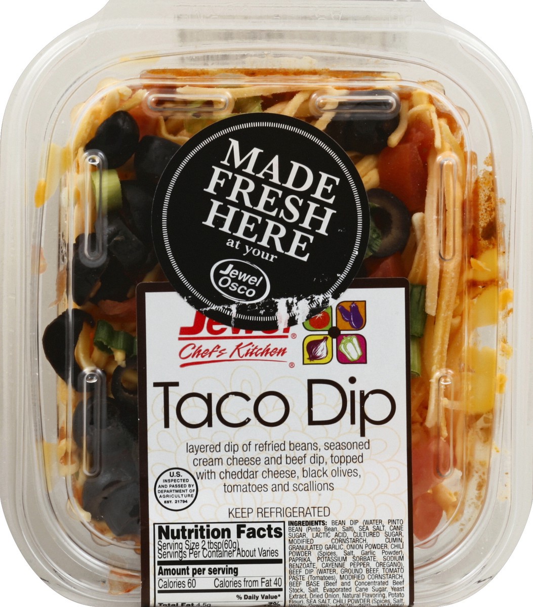 Layered dip of refried beans\, seasoned cream cheese and beef dip\, topped with cheddar cheese\, black olives\, tomatoes and scallions. US inspected and passed by Department of Agriculture. Made fresh…