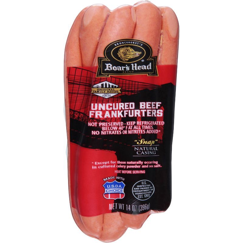 Crafted from an original family recipe, Boar's Head® Uncured Beef Frankfurters are made with USDA Choice Beef and select seasonings for an exceptional flavor and a bite with a "snap". Boar's Head food…