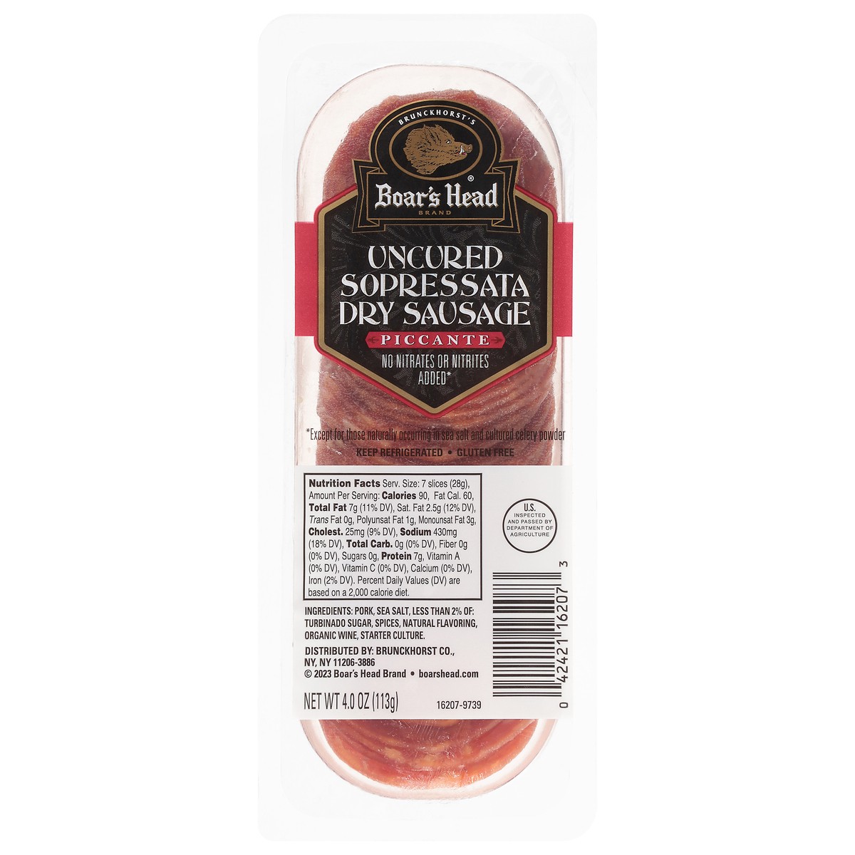 A spicy blend of hand-trimmed, coarsely chopped pork with authentic seasonings, Boar's Head Uncured Sopressata Piccante is naturally aged to create a zesty take on a time-honored Italian classic.