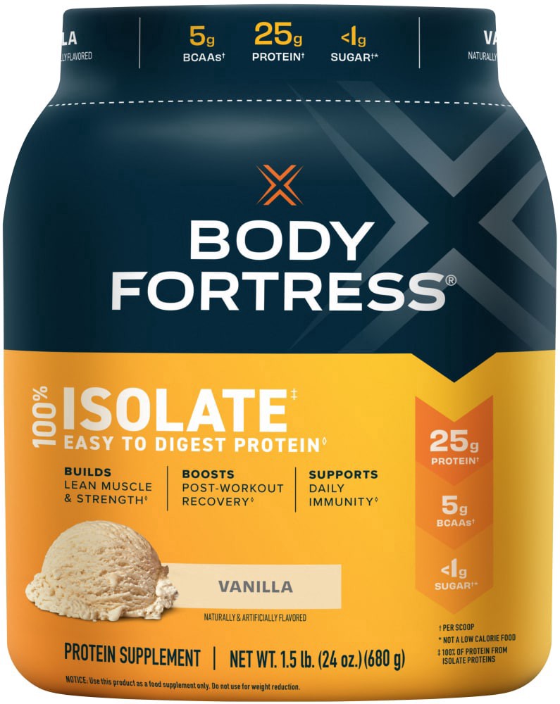 Body Fortress Super Advanced Isolate Protein is a blend of Whey, Soy, and Milk Protein Isolates with reduced amounts of unwanted fat and carbs. For adults, mix one (1) scoop to 6-8 ounces or two (2) s…