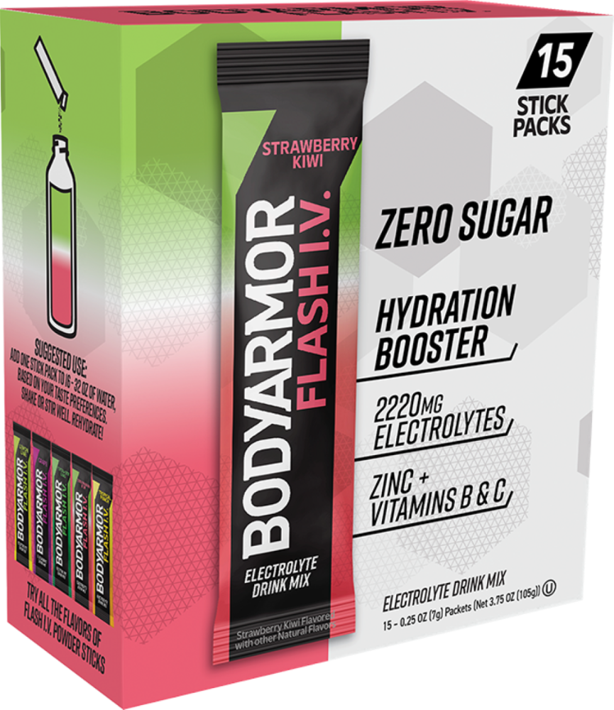 When staying hydrated is non-negotiable, BODYARMOR Flash I.V. Strawberry Kiwi electrolyte powders are what you need for an easy, on-the-go hydration boost. Just pour a powder hydration booster into yo…