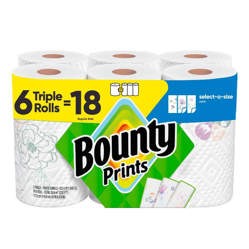 - Pack contains 6 Triple Rolls of printed Bounty Select-A-Size Paper Towels