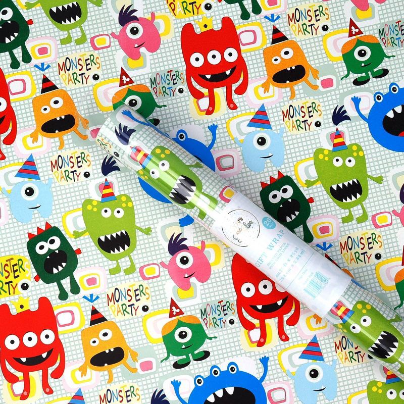 Bows And Sparkles 96"x30" Monsters Birthday Gift Wrapping Paper White