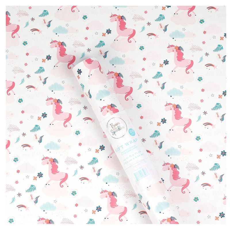Bows And Sparkles 96"x30" Unicorns Gift Wrapping Paper White/Pink