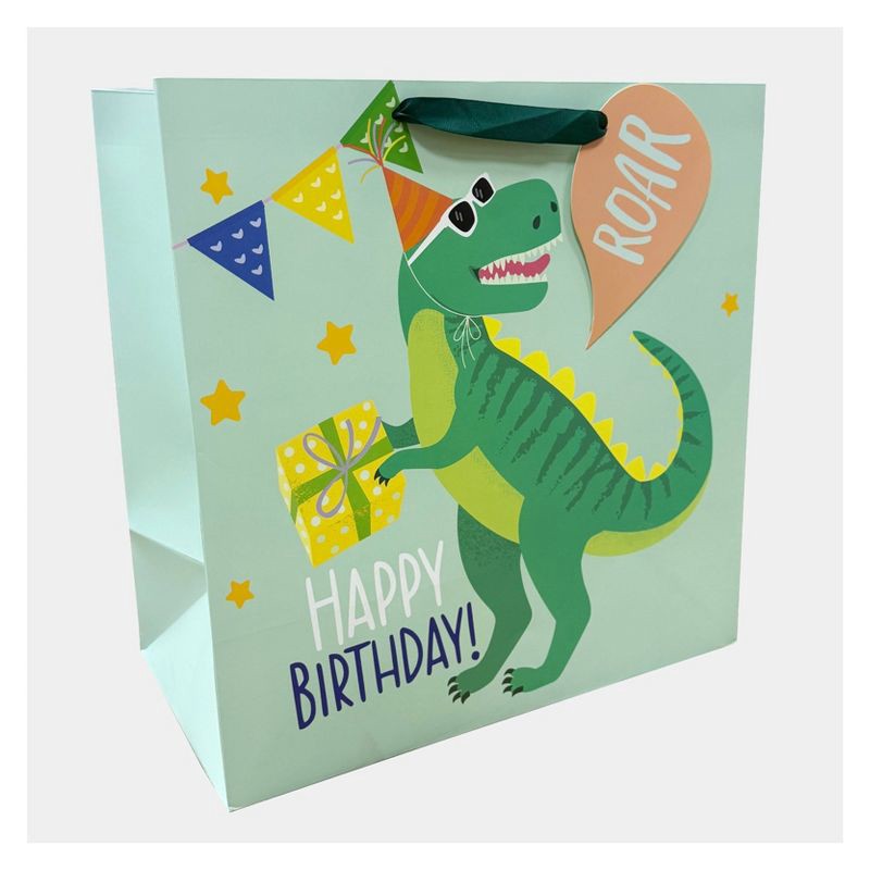 Bows and Sparkles Large Square Dinosaur Birthday Gift Bag with Tag Green